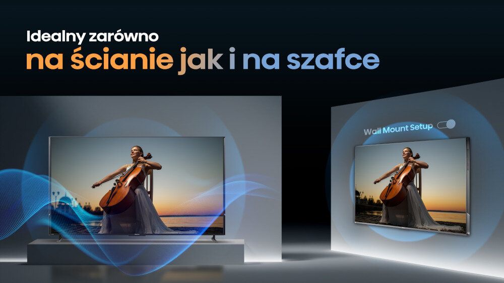 Адаптированный режим настенного крепления гарантирует, что басы и весь звук будут звучать идеально независимо от местоположения телевизора. Вы можете разместить телевизор на шкафу или повесить его на стену. Во время настройки выберите положение экрана, и телевизор соответствующим образом отрегулирует звук из динамиков и низкие частоты.