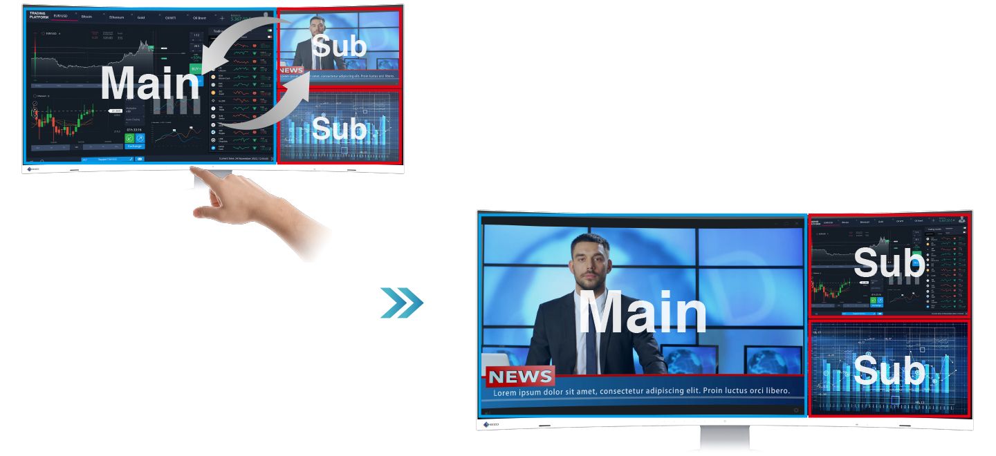 Когда в режиме «Картинка за картинкой» одновременно отображаются изображения из трех разных источников, функция замены главного окна позволяет мгновенно изменить расположение окон. Это позволяет вам сосредоточиться на той информации, которая наиболее необходима в данный момент.