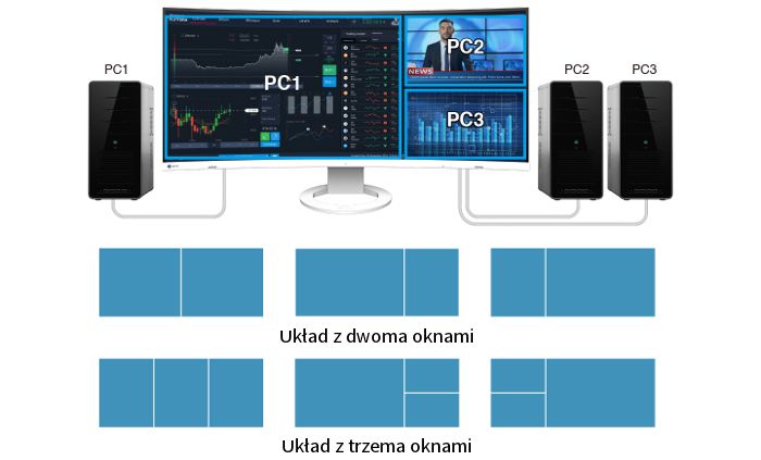 Picture-by-Picture (PbyP) позволяет отображать сигналы из трех источников одновременно. Это означает, что вам не придется тратить время на переключение между источниками аудио и видео при использовании более чем одного компьютера. Доступно 6 предустановленных макетов окон PbyP.