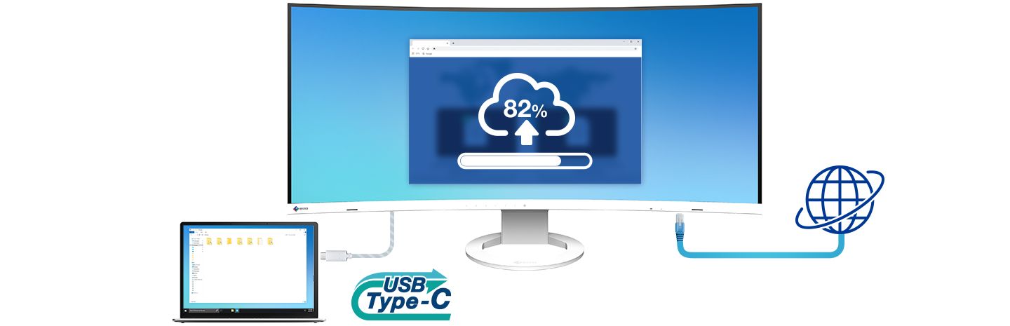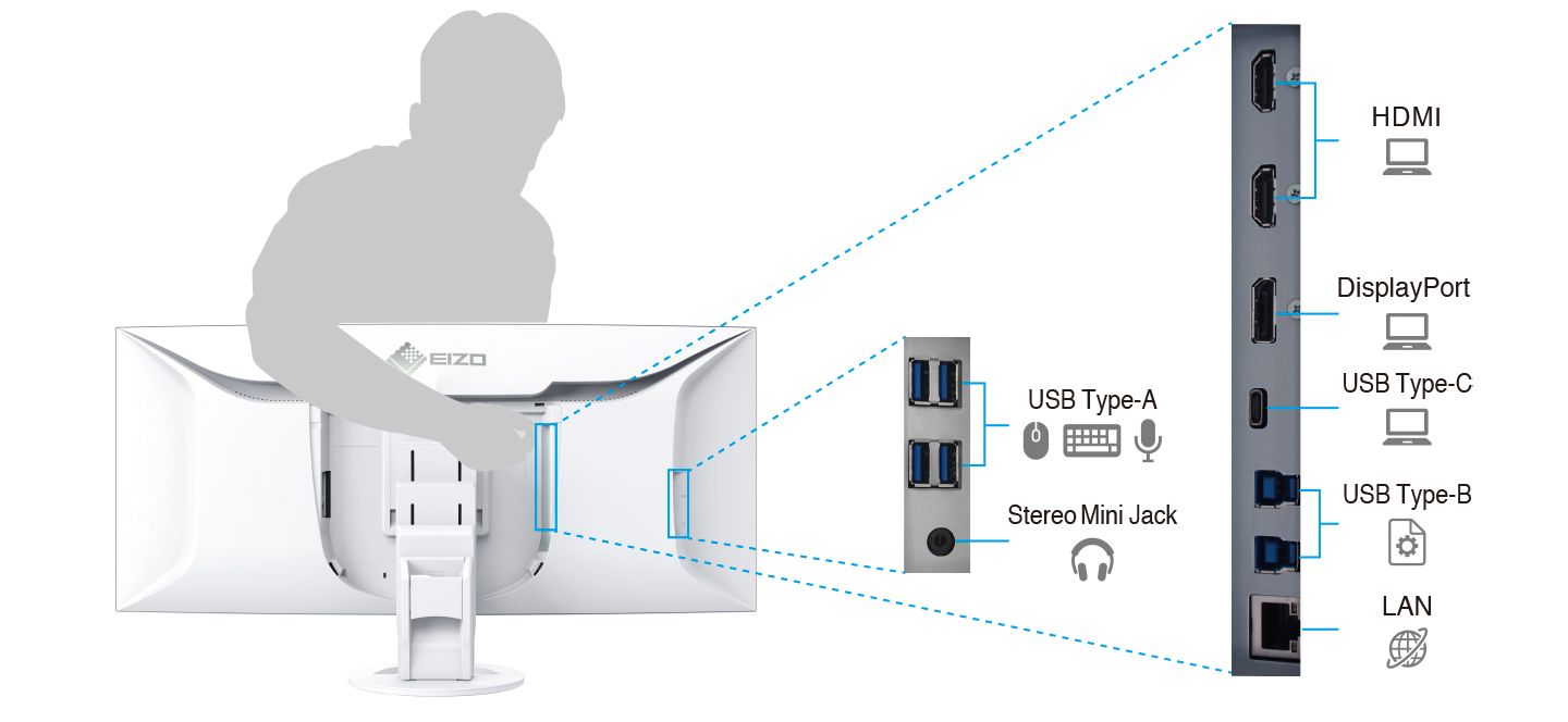 Многие современные ноутбуки не имеют порта LAN, поэтому EV3895 оснащен встроенным разъемом, обеспечивающим проводное подключение к сети. Просто подключите любой ноутбук к порту USB-C монитора, чтобы получить доступ к сети. Благодаря этому вы можете свободно проводить конференц-связь или передавать данные на высокой скорости.
