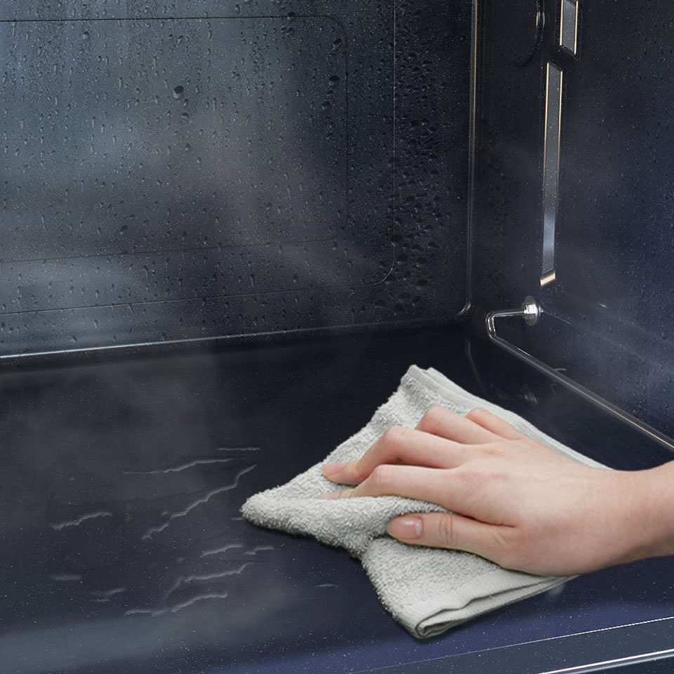 Забудьте о ручной чистке микроволновой печи внутри. Просто налейте воду на дно и нажмите кнопку, и в камере создастся пар, который размягчит остатки пищи. Избавьтесь от грязи, протерев внутреннюю часть мягкой тканью.