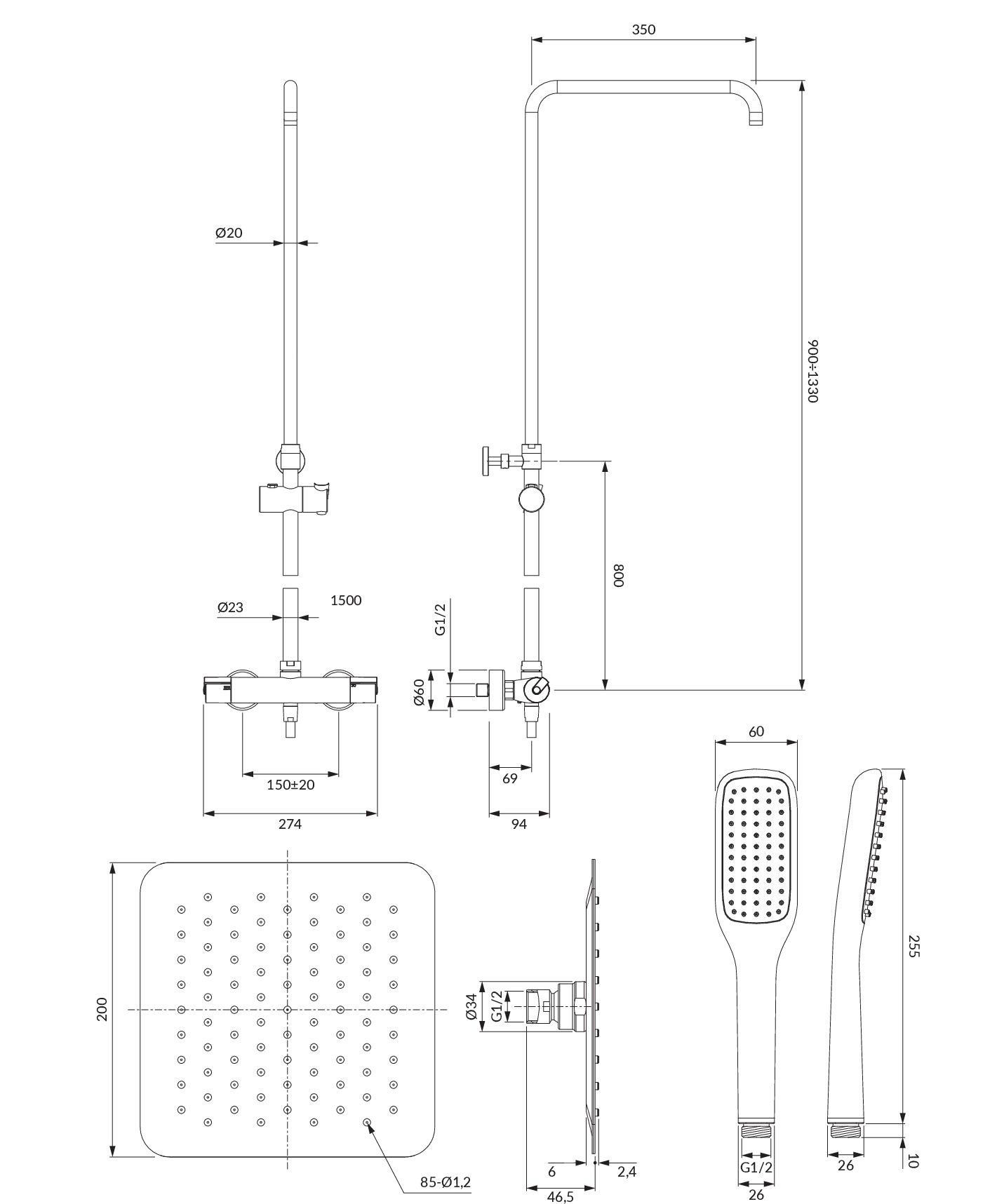 Термостатическая душевая система, открытая, квадратная Y1244X/6/KCR