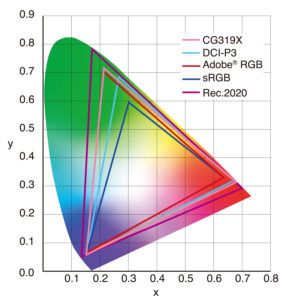 Цветопередача соответствует отраслевым стандартам. ColorEdge CG319X воспроизводит до 98 % пространства DCI-P3, используемого в цифровой кинематографии, а также 99 % пространства Adobe RGB. Широкая цветовая гамма также обеспечивает точное воспроизведение всех цветовых пространств CMYK (с покрытием ISO и с покрытием US Web), используемых при печати. Монитор также поддерживает стандарт передачи Rec.2020.