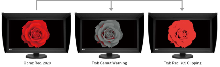 CG319X предлагает специальный режим работы с предупреждением о гамме. Если этот параметр выбран, монитор обнаруживает области изображения Rec.2020, которые невозможно воспроизвести в стандарте Rec.709, и преобразует их в оттенки серого. Пользователю также доступен режим Rec.709 Clipping, который позволяет просматривать изображения Rec.2020 в цветовом пространстве Rec.709 и показывает, как они будут выглядеть на HDTV.