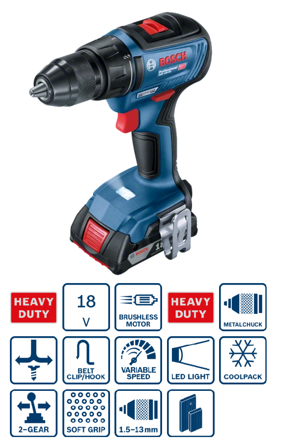 Напряжение аккумулятора: 18 В Крутящий момент (мягкий/жесткий/макс.): 28/50/50 Нм Вес без аккумулятора: 1 кг. Скорость холостого хода (1-я/2-я передача): 0-460/0-1800 мин-1 Диапазон зажима сверлильного патрона мин/макс: 1,5/13 мм Количество диапазонов крутящего момента: 20+1 Тип аккумулятора: Литий-ионный