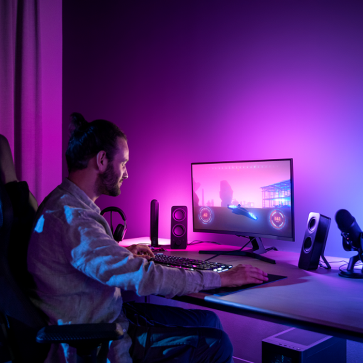 Получите красочное градиентное освещение, реагирующее на изображение, для игр. Светодиодную ленту Play Gradient для ПК можно прикрепить к задней части монитора с диагональю от 32 до 34 дюймов с помощью прилагаемых креплений. Активируйте синхронизацию с приложением Hue Sync и посмотрите, как действие на экране меняет освещение. В комплект входит Hue Bridge.