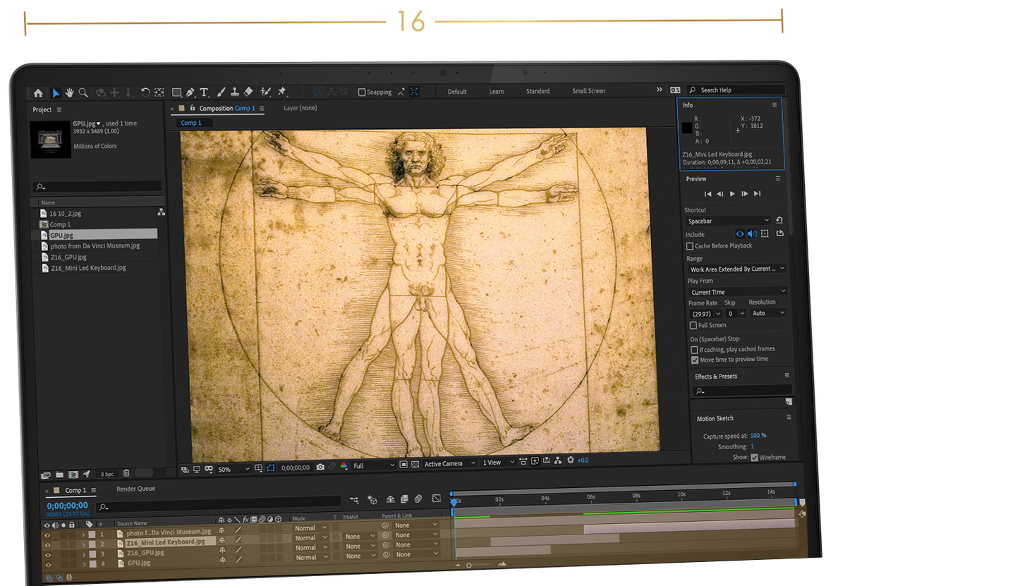Дисплей золотого сечения, совместимый с пером MSI. Дисплей золотого сечения с соотношением сторон 16:10 обеспечивает дополнительное рабочее пространство и плавное отображение созданного изображения, чтобы вы могли создавать больше. Дайте волю своему воображению с Creator Z16P.