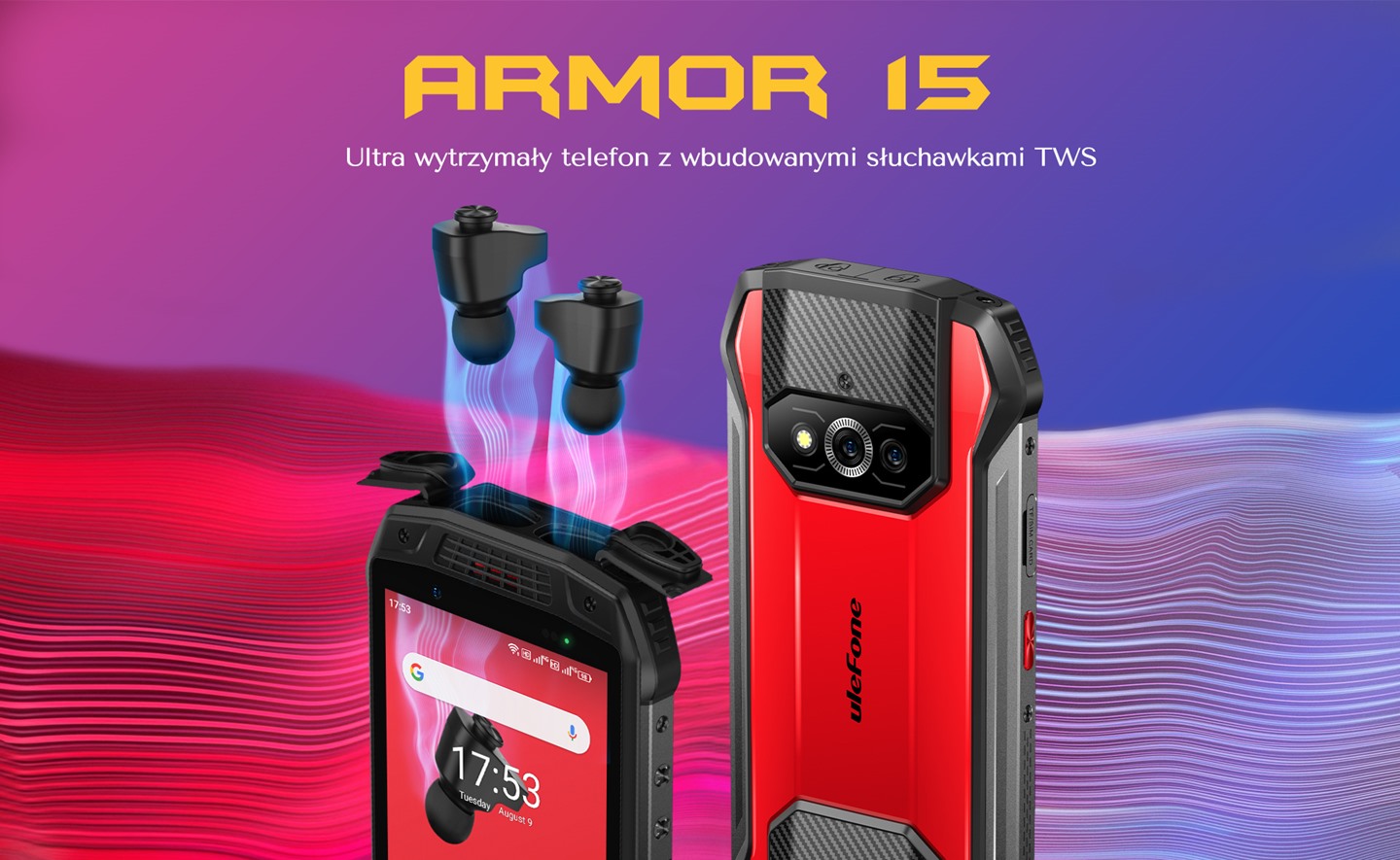 Armor 15 — це перший у світі надійний телефон із вбудованими бездротовими навушниками. Акумулятор в телефоні забезпечує до 100 зарядок навушників, що забезпечує до 505 годин роботи. Як тільки ви дістанете навушники, вони автоматично підключаться до вашого телефону. Ваші навушники завжди будуть з вами.