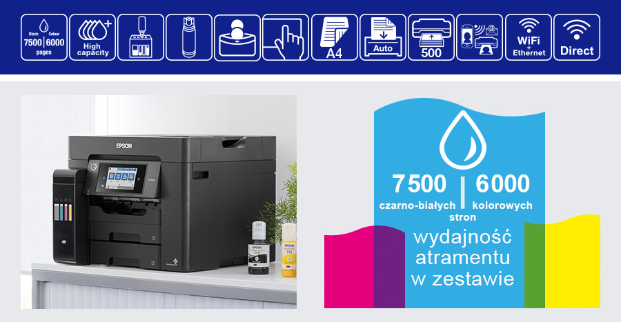 Надшвидкий друк і сканування_x000D_ До 25 об/хв2 для чорно-білого друку та до 12 об/хв2 для кольорового друку _x000D_ Надзвичайно низька вартість сторінки _x000D_ Економна система постійної подачі чорнила_x000D_ _x000D_ Функції мобільного друку та підключення_x000D_ Wi-Fi, Wi-Fi Direct, Ethernet і безкоштовні мобільні програми для друку3 _x000D_ Розроблено з думкою про бізнес 2 x A4 лоток на 250 аркушів спереду, лоток на 50 аркушів ззаду, автоматичний. пристрій подачі на 50 аркушів документів А4 _x000D_ Простий у використанні передній чорнильний картридж _x000D_ Легке та зручне заповнення чорнилом без проблем завдяки вдосконаленим флаконам із замком на ключ