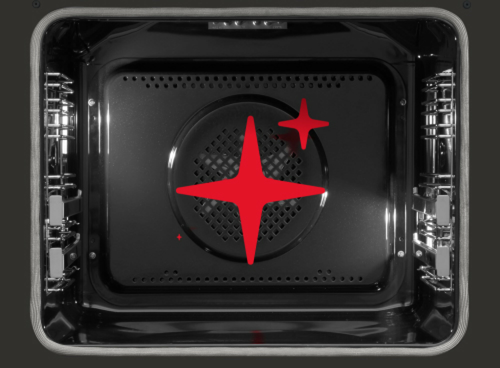 Завдяки функції парового очищення очищення духовки більше не буде таким обтяжливим. Пар розм'якшує забруднення, а очищення зводиться до того, що на деко потрібно налити 1 склянку води, розігріти духовку до 50°C і залишити пристрій на 30 хвилин. Розм’якшений парою бруд можна легко видалити з усієї духовки за допомогою губки з водою та рідиною для миття посуду. Плями жиру та інші забруднення зникнуть без використання шкідливих хімікатів