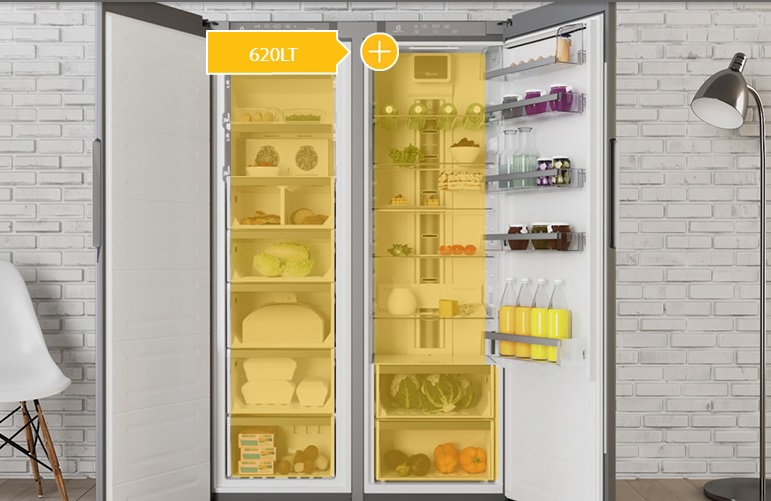 Grand Side by Side допоможе зберігати та заморожувати продукти. Передова технологія 6th Sense дозволяє інтелектуально контролювати рівень температури та вологості, автоматично вирівнюючи їх, коли це необхідно. Завдяки цій технології ваші продукти довше збережуть свої властивості та свіжість. Крім того, опція розширення гарантує загальну місткість до 620 л.
