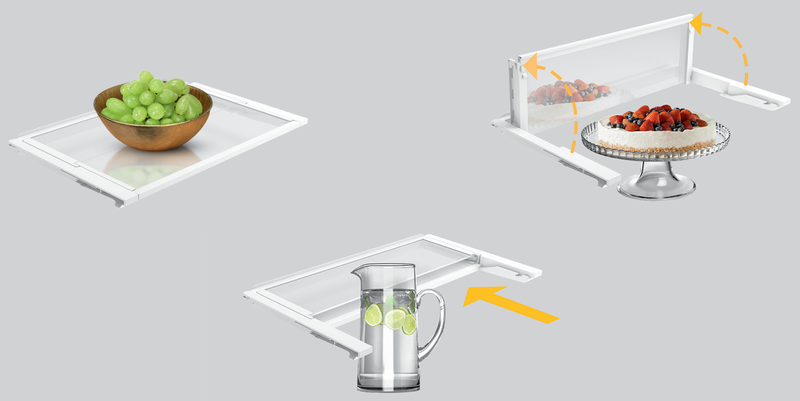 Завдяки 3 різним конфігураціям полиць Flexi Shelf+ ви можете регулювати простір у холодильнику відповідно до своїх потреб. • Складіть полицю навпіл, щоб зберігати високу пляшку чи глечик • Повністю складіть полицю, щоб помістити великі каструлі чи інші невеликі предмети • Залиште її розкладеною для щоденного використання