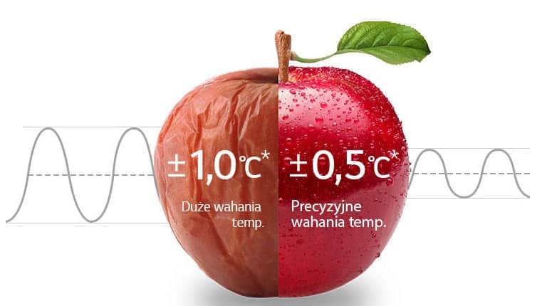 *На основі результатів тестування UL із використанням внутрішнього методу LG для вимірювання середніх пікових температур у відділенні для свіжих продуктів; протестовані моделі LGE: холодильник GBB72NSDFN з нижньою морозильною камерою (±0,5 ℃), холодильник GF-L570PL French Door (±0,5 ℃), холодильник J811NS35 Side by Side (±0,5 ℃), холодильник із верхньою морозильною камерою B607S (±0,5 ℃) і холодильник/ Верхня морозильна камера B606S (±1,0 ℃).* Без завантаження та з нормальною температурою. Результати можуть відрізнятися залежно від фактичного використання.