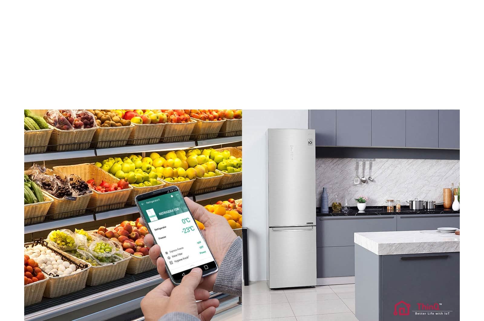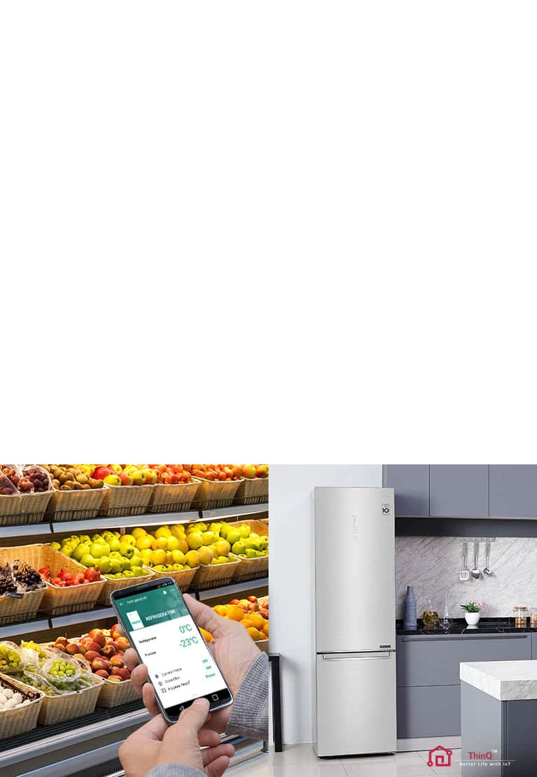 Використовуйте свій сумісний смартфон і програму LG SmartThinQ™, щоб дистанційно регулювати температуру холодильника для всіх продуктів, які ви в ньому зберігаєте*.