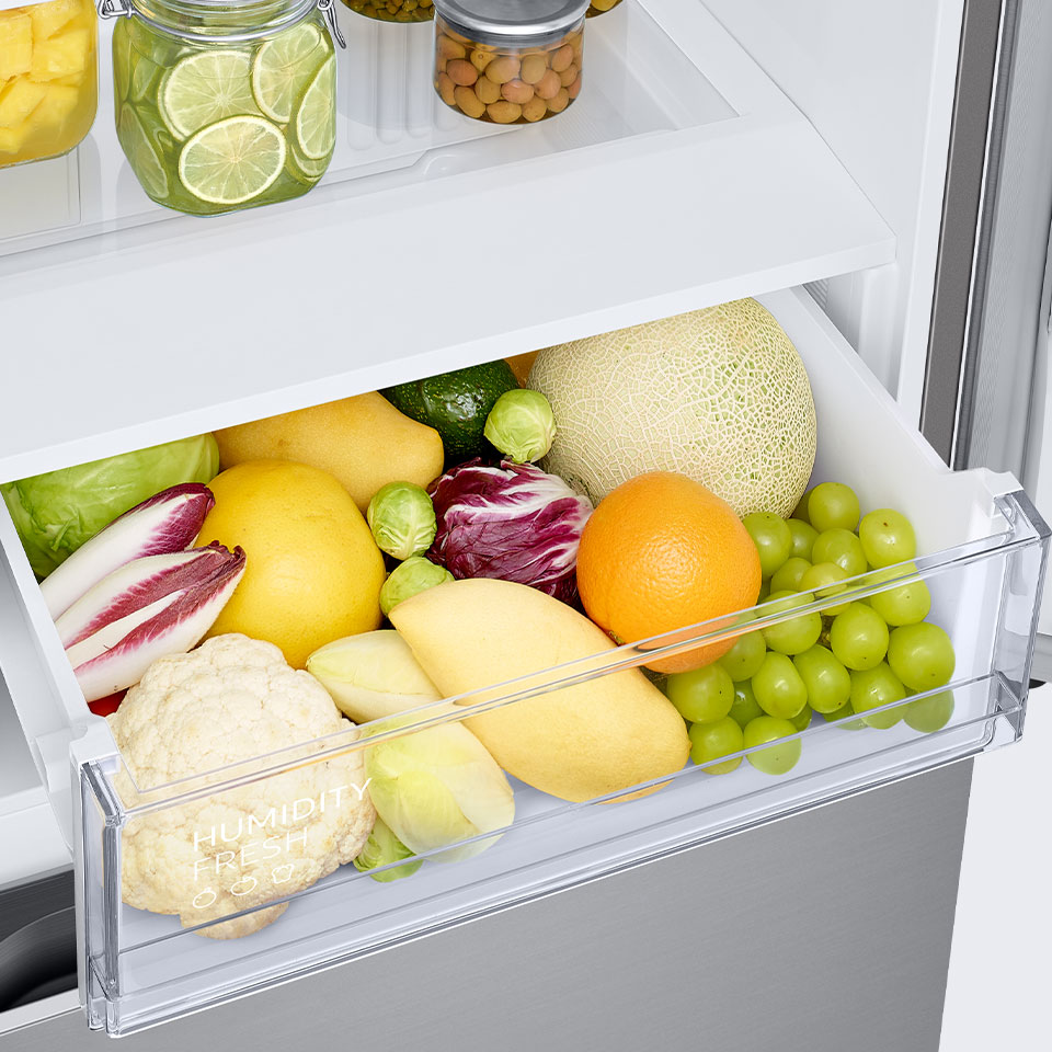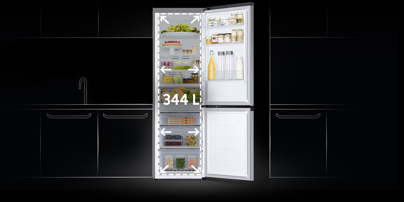Якщо ви шукаєте холодильник великої місткості та стандартних зовнішніх розмірів, оберіть холодильник із морозильною камерою Samsung із технологією SpaceMax™. Високоефективна система ізоляції дозволила зменшити товщину стінок, завдяки чому всередині стало більше місця для продуктів. Модель RB34C600DSA має об’єм 344 л, з яких 230 л знаходиться в холодильнику та 114 л в морозильній камері.