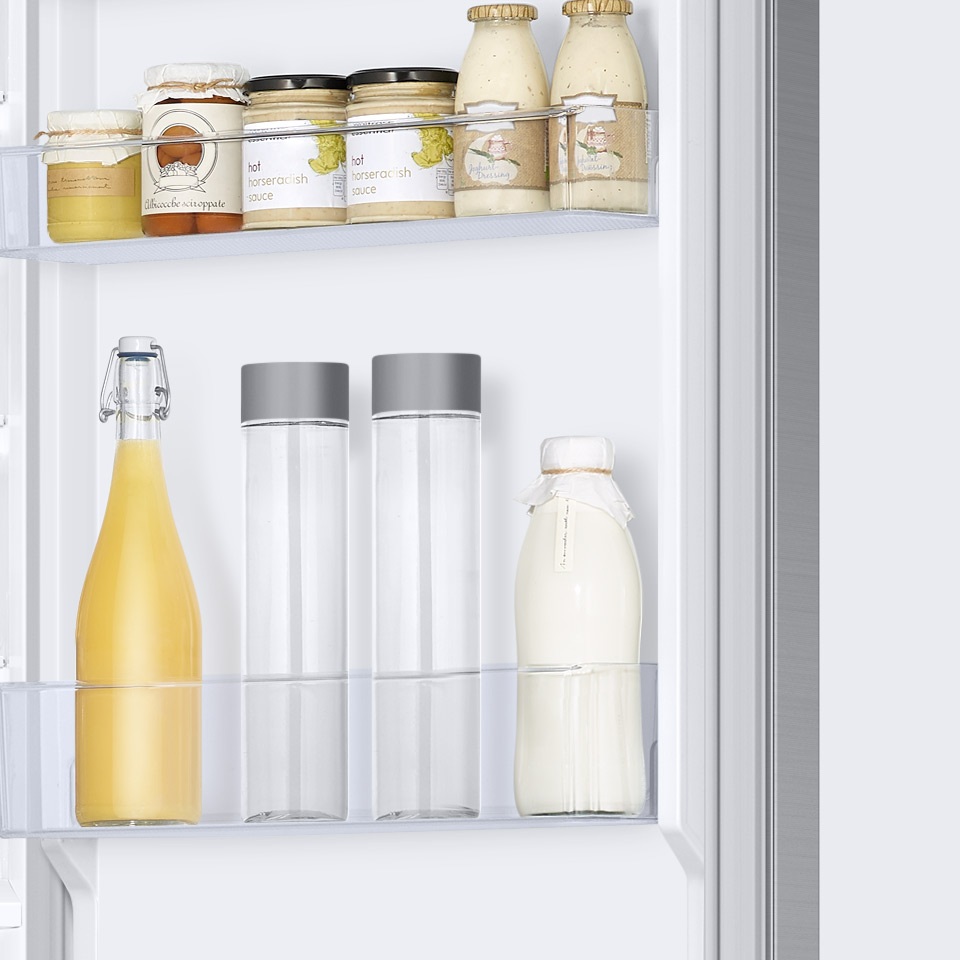 На дверцятах холодильника є три контейнери, які мають достатню глибину, щоб легко вмістити навіть великі пляшки та коробки з молоком або напоями. Таким чином ви легко залишите місце на основних полицях.