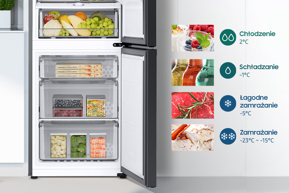 За допомогою роздільника розділіть його на дві зони з різними температурами⁵. У лівій частині буде холодніше (наприклад, -1°C), що ідеально підходить для зберігання м’яса, риби чи нарізки, а в другій, більш теплій частині (наприклад, 1°C) можна одночасно зберігати фрукти та овочі.