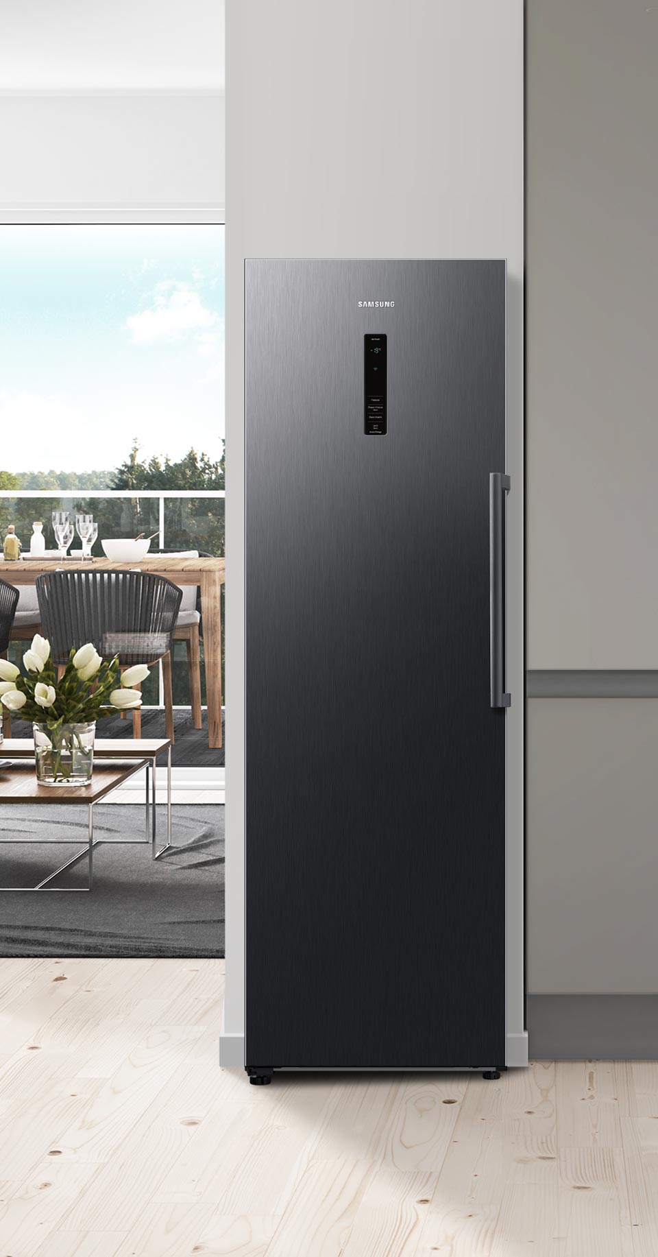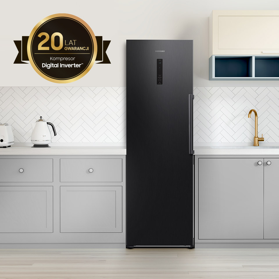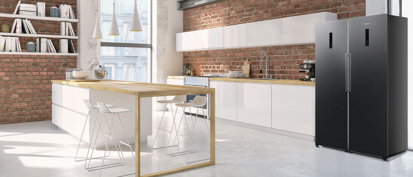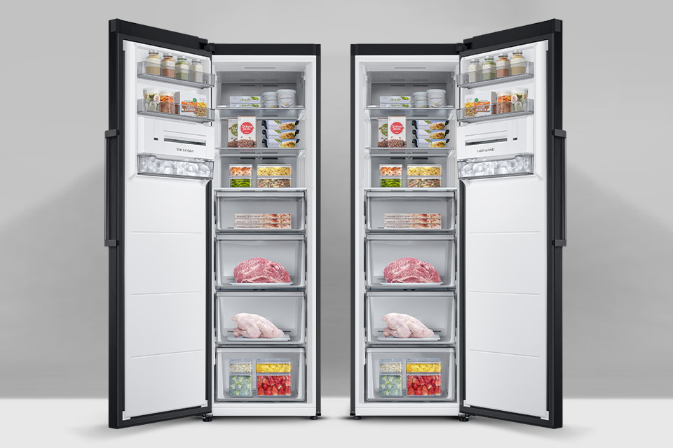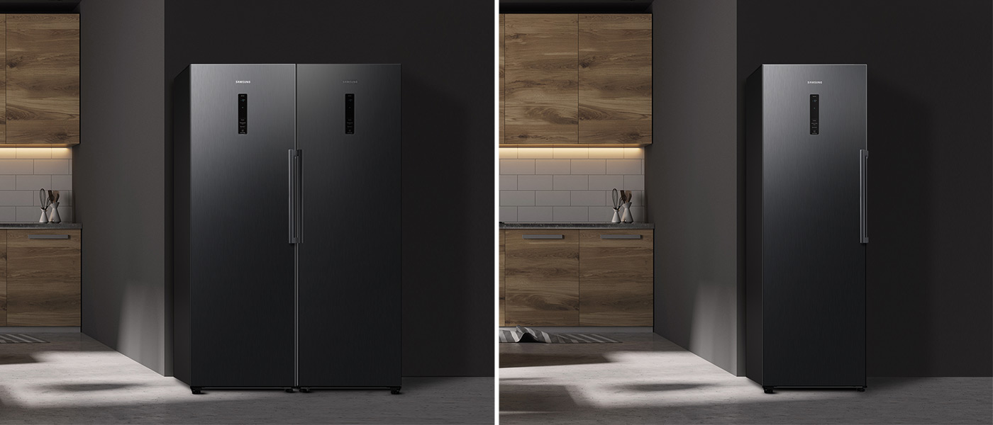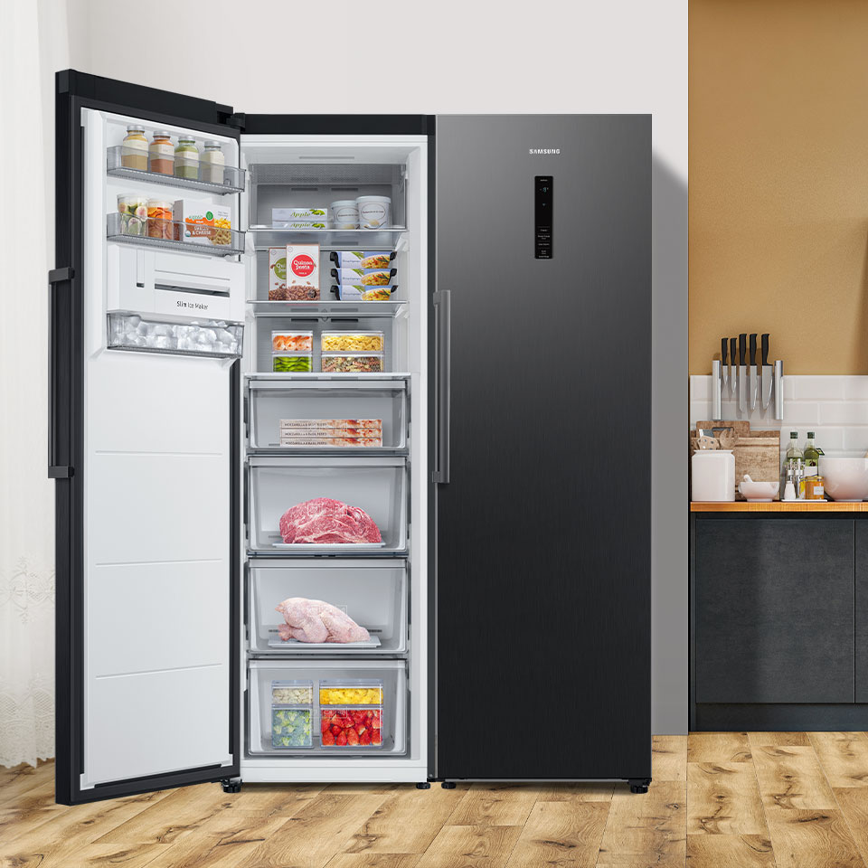 Однодверна морозильна камера Samsung є частиною унікальної серії TWIN. Ви можете поєднати його з холодильником, щоб створити ідеально підібрану дводверну холодильну камеру з морозильною камерою. Морозильна камера в поєднанні з холодильником створює набір з безпрецедентною ємністю 700 л.У вас ніколи не вистачить місця для страв на день народження чи Різдво. Завдяки тому, що холодильник і морозильна камера³ мають одні двері, їх можна розташувати разом або окремо - обидва варіанти ідеально впишуться в інтер'єр кухні.