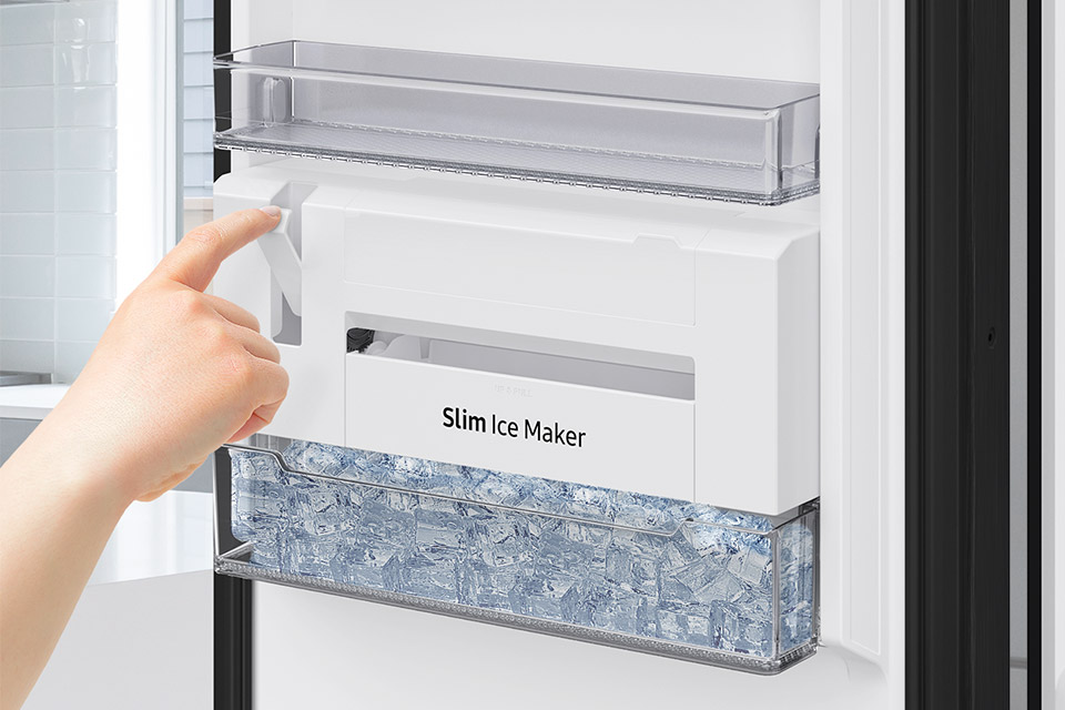 Льодогенератор SLIM не займає дорогоцінного місця в морозильній камері. Завдяки тому, що він вбудований в дверцята пристрою, він забезпечує легкий доступ і дозволяє робити кубики льоду одним дотиком.