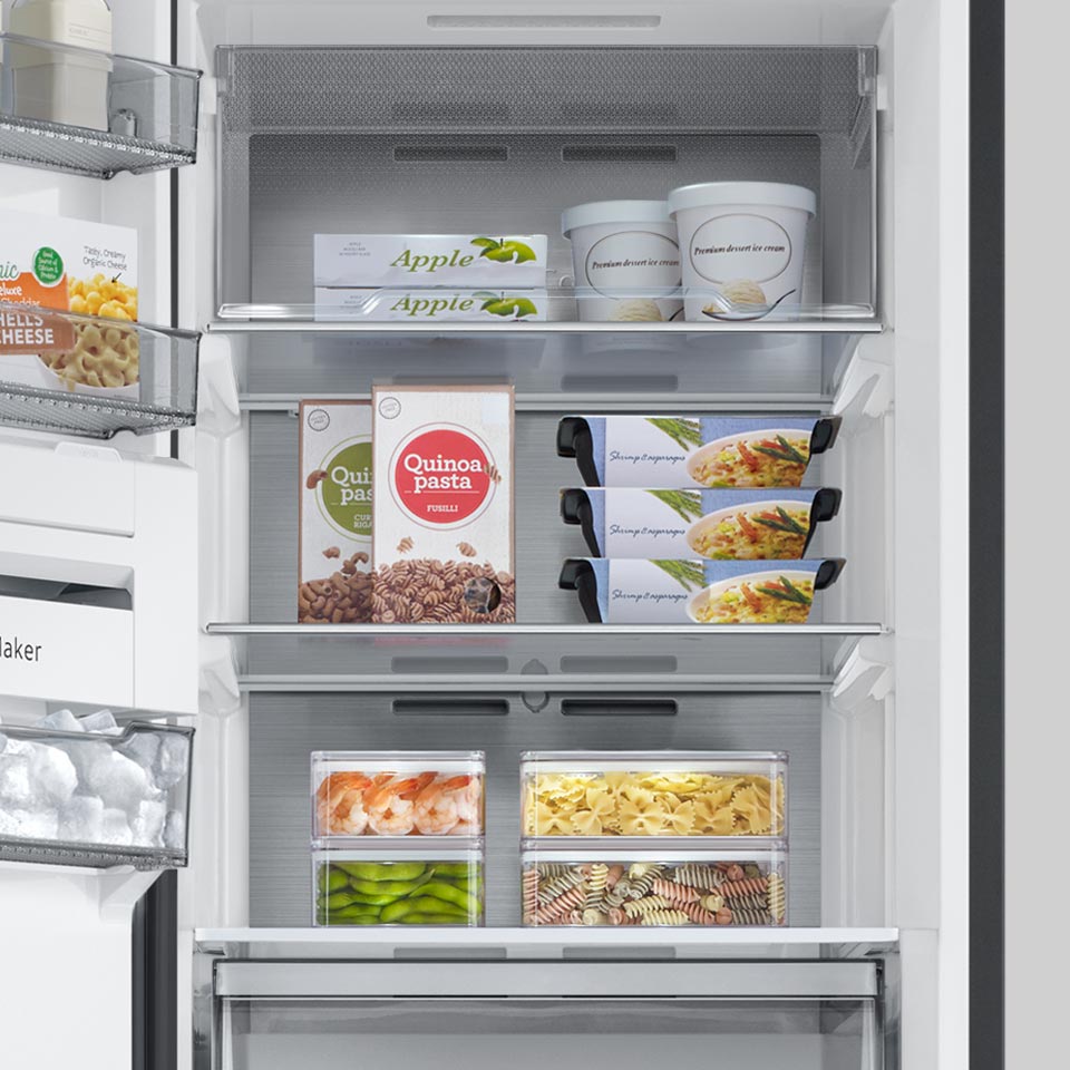 У морозильній камері Samsung є багато місця. Приміщення було ретельно спроектовано для зручного зберігання продуктів. Ви можете вільно розташувати полиці відповідно до ваших потреб. Також використовуйте дверні контейнери, щоб залишити більше місця в основних відділеннях.