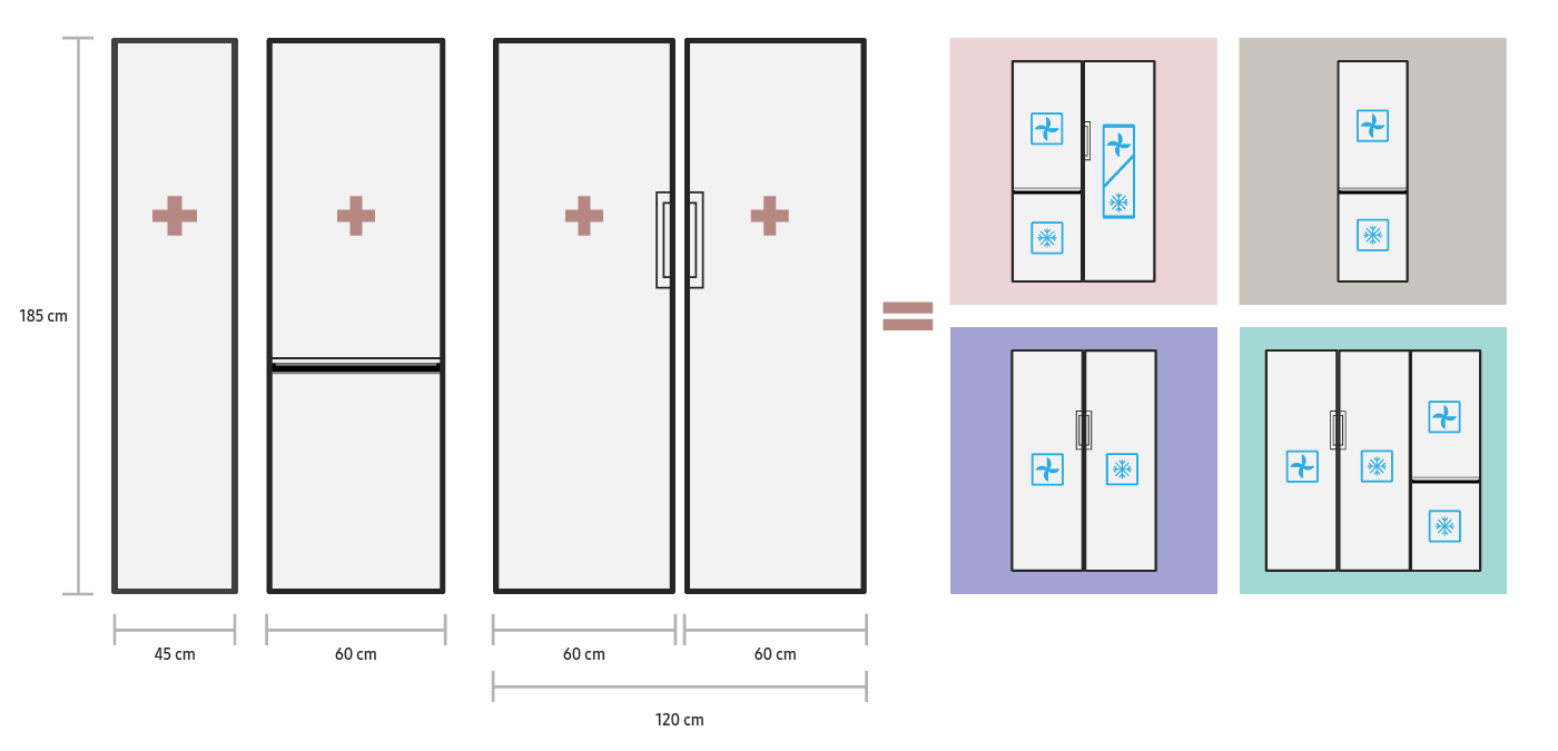 Індивідуальні холодильники можна легко підібрати відповідно до вашого стилю та потреб. Ви можете спроектувати їх з нуля, вибравши власну комбінацію холодильника та морозильника. Окрім модулів, у вас також є можливість вибрати передні панелі багатьох різних кольорів, які ви можете будь-коли замінити на нові.