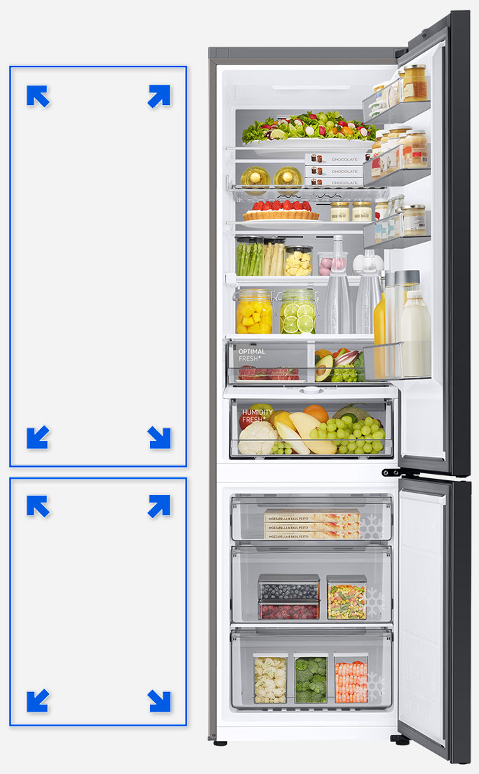 Змінні панелі дозволяють персоналізувати ваш холодильник Samsung. Комбінуйте різні кольори і текстури. Вибирайте між глянцевими або матовими скляними панелями та панелями з металевим оздобленням - із благородної, матової або пофарбованої сталі. Підберіть всю передню частину в один колір або комбінуйте їх, як вам подобається. Світлий зверху і темний знизу? Рішення за вами.