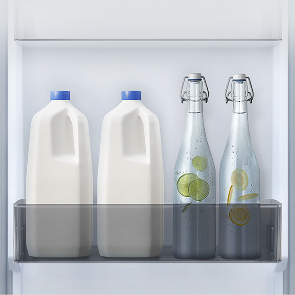 На дверцятах холодильника є 4 глибокі контейнери, які ідеально підходять для консервів, пляшок і картонних коробок з-під напоїв. Ви заощадите місце на основних полицях.