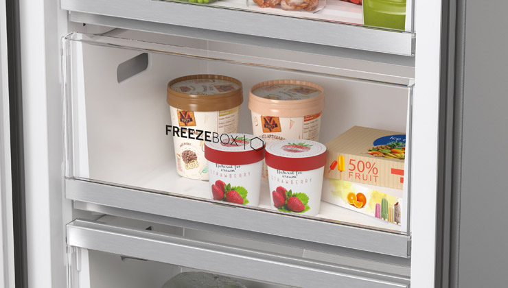 Місткі та прозорі шухляди гарантують винятково комфортне користування щодня. Конструкція висувних ящиків дозволяє їх легко виймати та легко переміщати, наприклад, на кухонну стільницю, щоб легко та швидко розмістити в них продукти, які потрібно заморозити, а потім знову помістити вже заповнені ящики в пристрій.