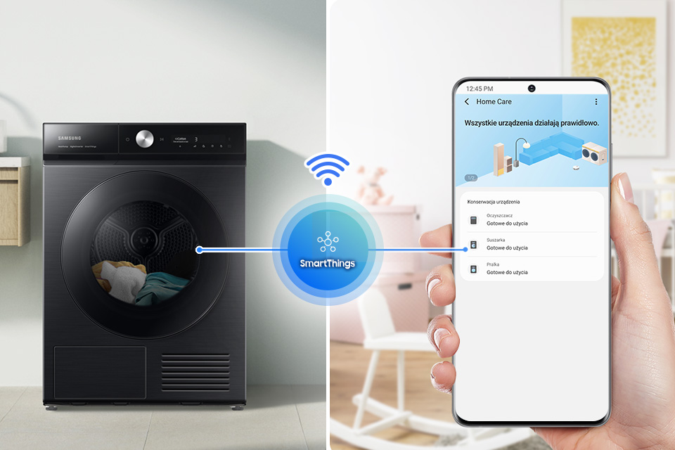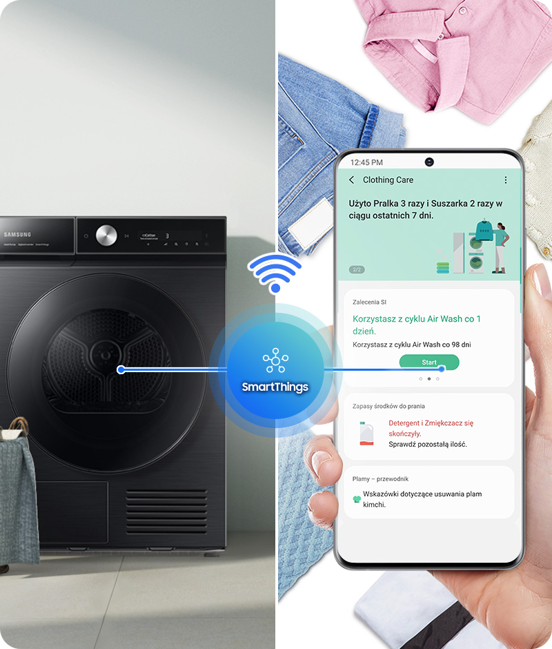 За допомогою програми SmartThings¹² ви гарантуєте, що програма сушіння найкраще відповідає типу завантаження. При цьому сам процес стане ефективнішим і гранично простим. Легко знайдіть потрібну програму, забезпечте ефективне керування енергією та подбайте про свій пристрій у нехитрий спосіб.