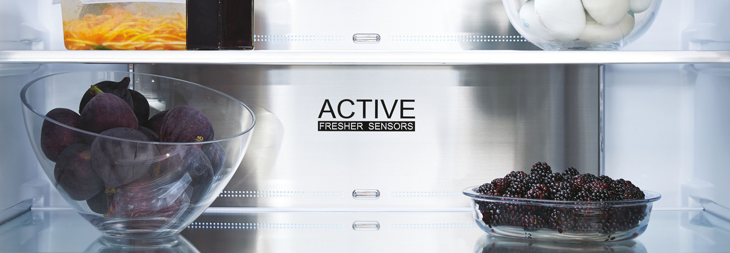 Щоб забезпечити рівномірний рівень температури в холодильнику, кожна полиця активно вентилюється. Датчики, розташовані уздовж полиць, відстежують температуру і при її коливаннях активують потік повітря, який вирівнює температуру всередині холодильника. Завдяки цьому, ставлячи продукти кімнатної температури в холодильник, ви можете бути впевнені, що це не порушить постійні та оптимальні умови зберігання їжі.