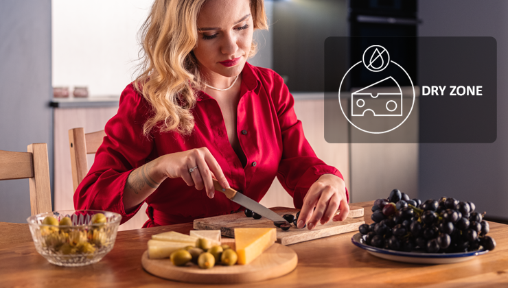 Суха зона — це місце, створене для зберігання харчових продуктів, які потребують меншої вологості, таких як сир, молочні продукти, сухофрукти та делікатеси. Завдяки використанню технології Fresher Techs® рівень вологості в ящику підтримується нижче 45%, забезпечуючи оптимальні умови для більш тривалого зберігання такого виду продуктів.