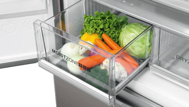 Спеціальна шухляда Moist Zone зберігає делікатні продукти свіжими вдвічі довше. Це завдяки технології HCS (Humidity Control System) – мембрані з рослинних волокон, яка підтримує вологість на рівні 90% і автоматично її контролює. Належна циркуляція прохолодного повітря всередині зони означає, що продукти, що зберігаються, довше зберігають свою поживну цінність.