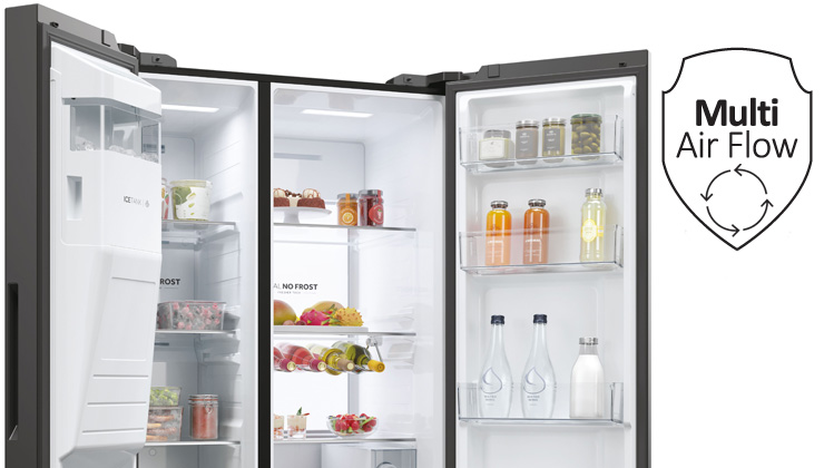 Multi Air Flow — це інноваційна технологія, яка розподіляє холодне повітря в холодильнику за допомогою спеціально розроблених випускних отворів, розташованих на задній стінці панелей No Frost. Це рішення дозволяє підтримувати постійну температуру в будь-яких умовах і гарантує оптимальне і тривале зберігання їжі.
