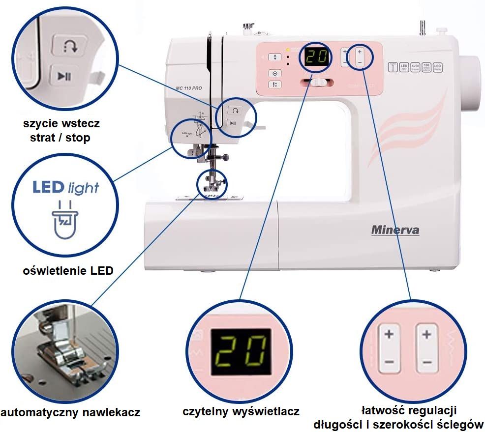 Minerva MC110pro — це міцна та довговічна комп’ютерна машина з надзвичайно спрощеною роботою. Це ідеальна пропозиція як для тих, хто починає шити, так і для більш складних проектів.