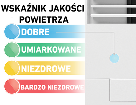 Зберігає інформацію про якість повітря в кімнаті. Поточний стан відображається чотирирівневим кольоровим підсвічуванням. Відповідні значки на дисплеї повідомлять вам, коли прийшов час очистити та замінити фільтри. Додатковою перевагою є можливість відключити підсвічування, що інформує про якість повітря, що особливо корисно після настання сутінків.