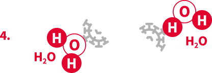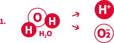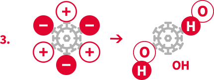 Іони Plasmacluster, зустрічаючи спори цвілі (частинки вірусів, бактерій), перетворюються на реакційноздатні гідроксильні групи (OH), які легко реагують зі спорами, витягуючи з них атоми водню (H) і знову перетворюючись на молекули води.