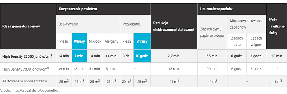 Для порівняння, пристрій із потужністю 7000 іонів за 49 хв. Віруси видаляються за 9 хвилин (генератор іонів 25 000) до 18 хвилин з генератором іонів 7 000. Різниця в ефективності видалення алергену ще більша. Це від 14 хвилин у випадку найвищого генератора іонів до 51 хвилини у випадку більш популярного генератора іонів із потужністю 7000 іонів на см3.