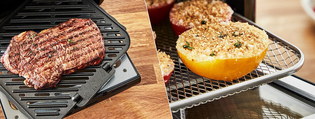 Стільки функцій в одному пристрої - від надзвичайно хрусткої їжі до чудового смаку на грилі! Урізноманітнюйте свої страви за допомогою 9 функцій для досягнення ідеальних результатів щоразу: смаження на теплому повітрі, запікання, гриль, приготування м’яса, підсмажування, сушіння, підсмажування, гриль і розігрівання.
