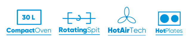 компактне поєднання духової шафи з усіма функціями з двоконфорочною електроплитою, приготування, гриль і запікання в одному пристрої, функція гриля з обертовим вертелом з власним приводом дозволяє легко готувати курку грильрізні варіанти приготування їжі - від картоплі фрі до пиріжків завдяки нагрівання знизу та/або зверху, функція конвекції та деко для гриля та запікання, що входять до комплекту, додаткові опції для смаження на сковороді/глибокій олії, можливість готувати на обох конфорках одночасно або лише на меншій під час використання духовки