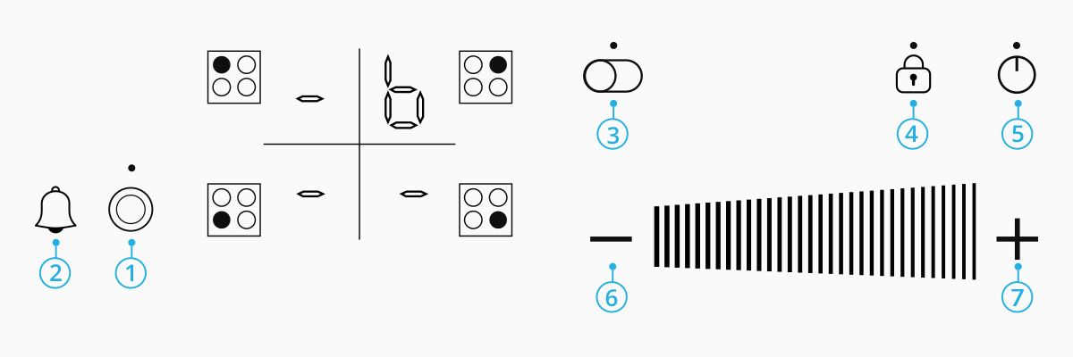 Цифрові дисплеї повідомляють про активні функції та налаштування пристрою. Коли обігрів вимкнено, індикатори залишкового тепла «H» зон показують, наскільки нагріті конфорки.