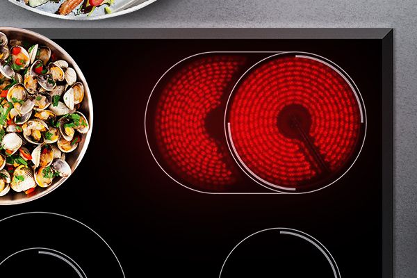 Різні каструлі, одна тарілка. Багатофункціональна зона нагріву Зони нагріву можна налаштувати відповідно до форми та розміру посудини. Завдяки овальній конфорці вам більше не доведеться турбуватися про те, як поставити довгасте блюдо на круглу конфорку. Тепер можна смажити навіть в овальній сковороді.