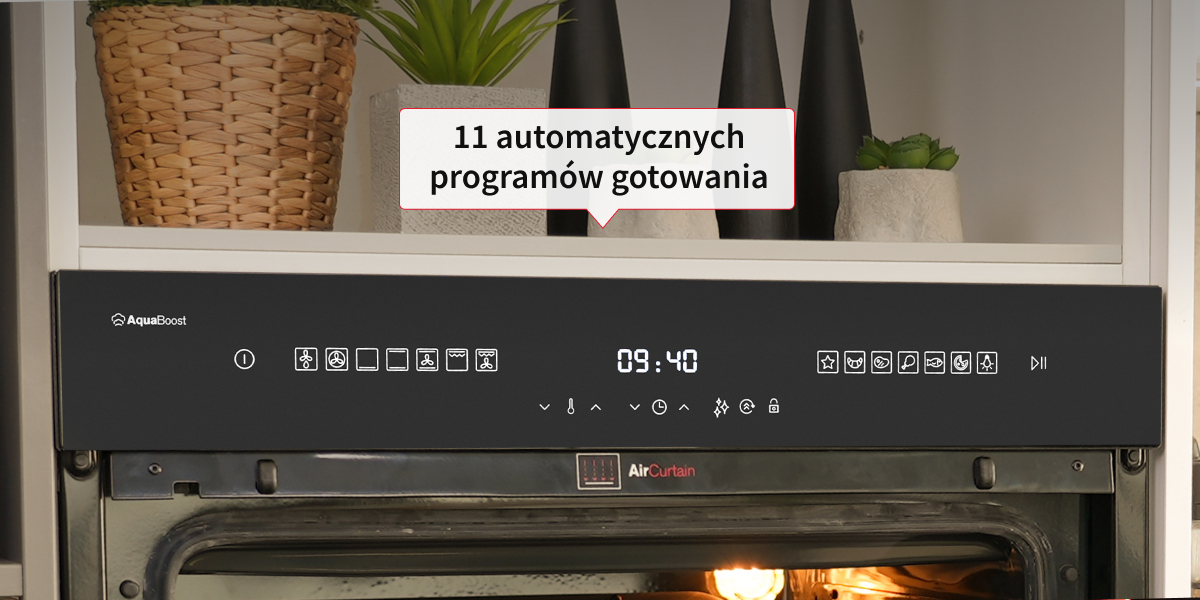 Вибирайте, вставляйте, вмикайте та насолоджуйтеся ідеально запеченими стравами Автоматичні програми випічки полегшать повсякденне приготування їжі. Ви можете використовувати 11 доступних автоматичних програм, щоб насолодитися ідеальною випічкою. Правильно налаштовані параметри випічки, такі як час, температура та потік повітря. Щоб прискорити процес нагріву духовки до потрібної температури в режимі Турбо, режимі конвекції, статичному режимі випікання або режимі піци, використовуйте функцію Boost.