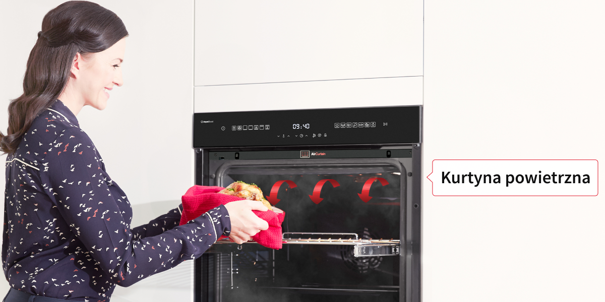 Захист від впливу гарячого повітря Повітряна завіса захищає від раптового вибуху гарячого повітря під час відкриття духовки. Завдяки цьому ви можете безпечно відкрити дверцята, щоб перевірити хід випікання або вийняти готову страву.