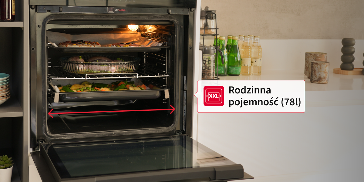 Велика місткість для сімейних потреб Духовка об'ємом 78 літрів забезпечує зручне приготування страв навіть для великої родини. Висота решіток і лотків може бути встановлена на 7 рівнів, а телескопічні напрямні – на 2. Це дає можливість готувати їжу на 2 рівнях одночасно. Це хороший спосіб приготувати велику кількість їжі одночасно.