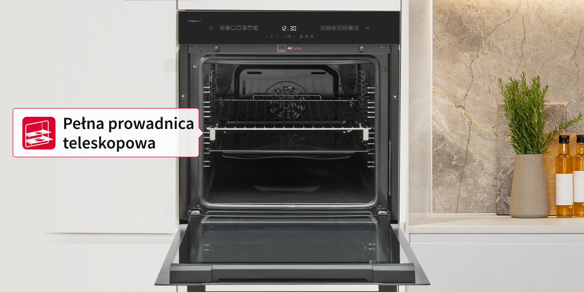 Зручне виймання навіть важких тарілок. Завдяки телескопічній направляючій виймання гарячого та важкого дека з духовки більше не проблема. Завдяки направляючій ви можете висунути всю решітку з гарячою стравою з зони гарячої духовки та безпечно вийняти її, не турбуючись про те, що торкнетеся гарячих елементів. Використання телескопічної направляючої не тільки полегшує завантаження та виймання важкого посуду, але й робить роботу з духовкою безпечнішою.