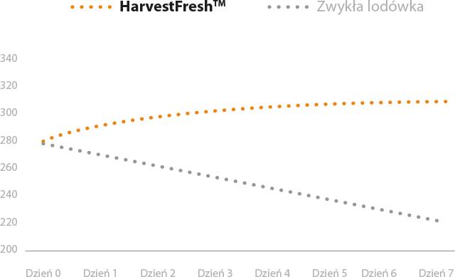 HarvestFreshІнноваційна технологія HarvestFresh™, яка використовує 3 кольори (синій, зелений і червоний), які імітують 24-годинний сонячний цикл. Завдяки цьому вітаміни А і С довше зберігаються у фруктах і овочах, які зберігаються в холодильнику.