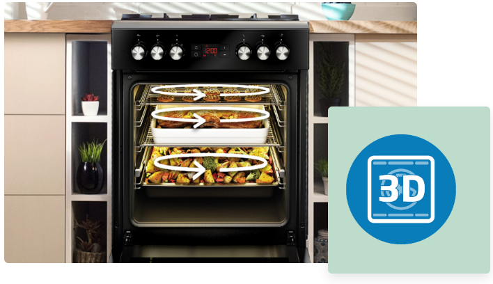 3D-випічка — це нове покоління випікання, яке активує всі нагрівальні елементи, наявні в даній моделі, і працює багатовимірно. Нагрівачі духовки працюють послідовно, щоб рівномірно розподілити тепло всередині. 3D-випічка також дозволяє випікати декілька страв одночасно.