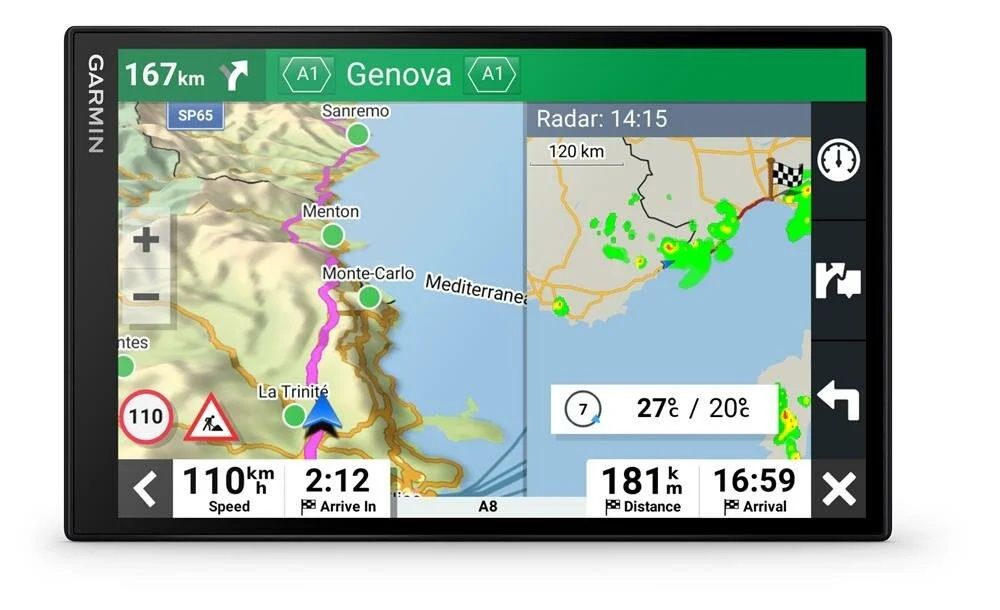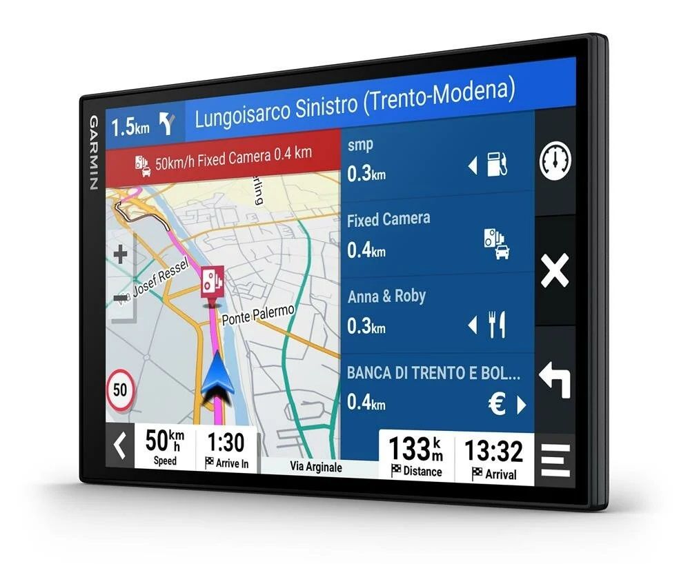 Навігація полегшує керування автомобілем завдяки чітким картам і детальним голосовим вказівкам Garmin Real Directions™. Щоб забезпечити максимальну безпеку під час руху, навігація повідомляє про круті повороти, залізничні переїзди та круті схили. Пристрій також надає вказівки щодо проїзду через екологічні зони.