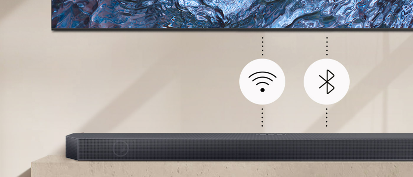 Підключіть звукову панель до телевізора через Wi-Fi або Bluetooth®, зберігаючи ідеальну синхронізацію звуку та зображення.