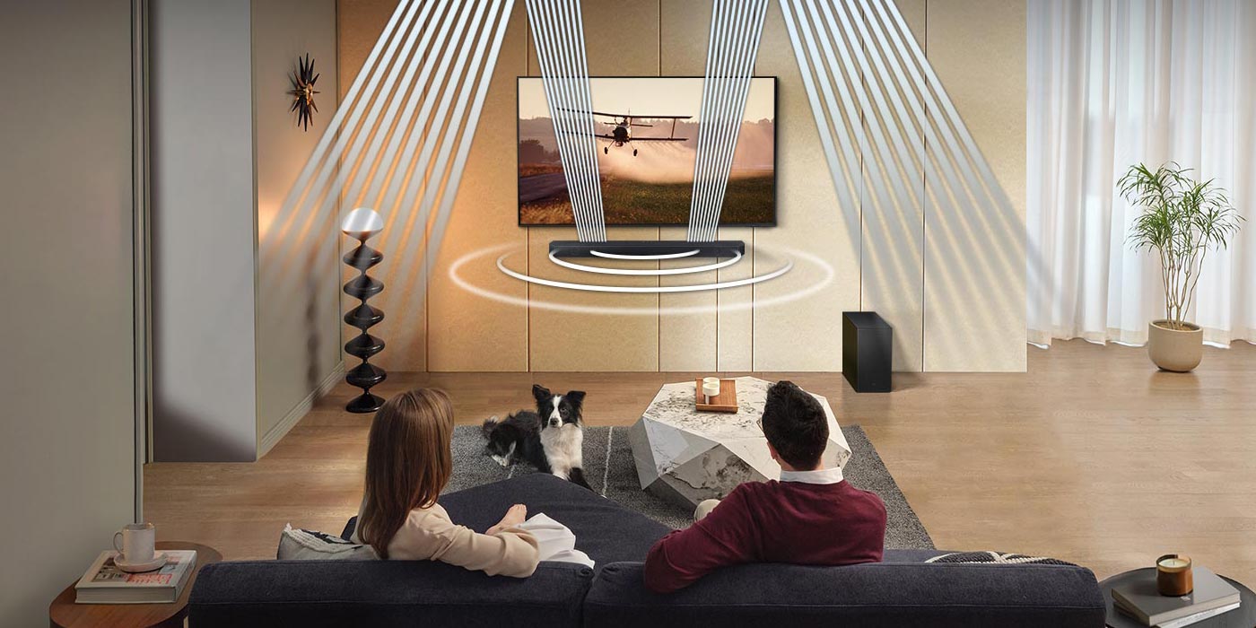 По бездротовому зв’язку під’єднайте звукову панель до телевізора та відкрийте просторовий кінематографічний звук завдяки технології Dolby Atmos, яка змусить вас почути кожен звук, що рухається над вами та навколо вас, як у реальному житті. Тепер ви можете оточити себе захоплюючим об’ємним звуком без додаткових кабелів.